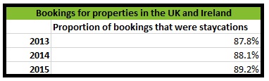 The proportion of staycations booked at properties in the UK and Ireland has steadily risen over the past three years, from 87.8% in 2013 to 89.2% in 2015.